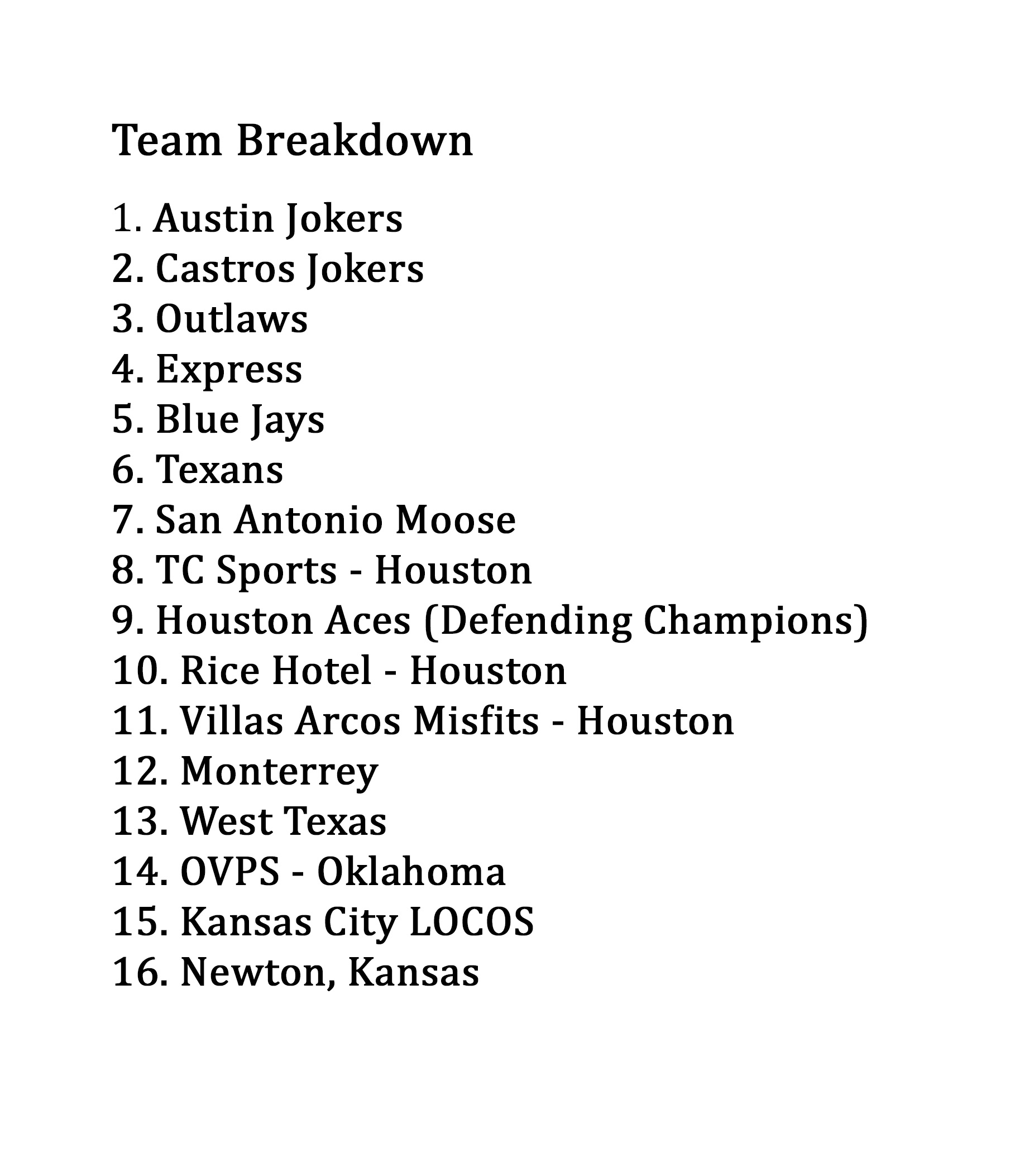***This tournament has filled up quickly within the past several years, so I suggest you contact Jesse as soon as possible if you want to be added to the interested team list to have the opportunity to pay first and avoid being on the waiting list. ***